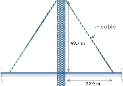 A suspension bridge is being built. The top of the concrete tower is $49.7$49.7 metres above the bridge and the connection point for the main cable is $22.9$22.9 metres from the tower. The concrete tower and the bridge are perpendicular to each other.