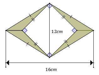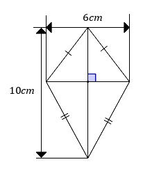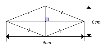 $\text{Area of a Rhombus }=\frac{1}{2}\times\text{diagonal 1}\times\text{diagonal 2}$Area of a Rhombus =12×diagonal 1×diagonal 2