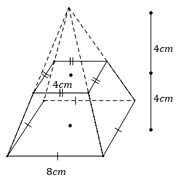 A small square pyramid of height $4$4 cm was removed from the top of a large square pyramid of height $8$8 cm forming the solid shown. Find the exact volume of the solid.