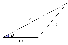 All three side lengths are known, so we can apply the cosine rule. The unknown angle $x$x appears opposite the side with length $9$9, so we should label this side with a $c$c. Since we are finding an angle, we should use the second, rearranged version of the cosine rule given above.