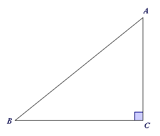 A right-angled $\triangle ACB$△ACB has its right angle at vertex C, depicted as a small blue square. Vertex A is positioned at the top right, directly above vertex C, and vertex B is located to the left of vertex C.