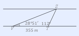 Judy and Xavier need to build a bridge over a river, along the line $ST$ST. In order to find out how long the bridge needs to be, Judy stays at point $T$T and measures the angle at $T$T to point $S$S to be $112^\circ$112° while Xavier walks for $355$355 m down the river to point $V$V where the angle to point $S$S is $28^\circ51'$28°51′.