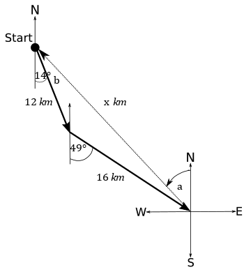 A boat travels $S$S$14^\circ$14°$E$E for $12$12 km and then changes direction to $S$S$49^\circ$49°$E$E for another $16$16 km.