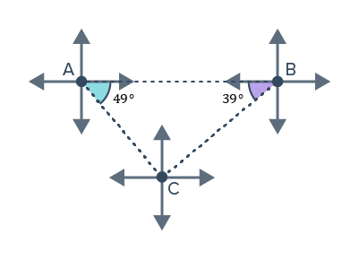 In the figure below, point $B$B is due East of point $A$A. We want to find the position of point $A$A relative to point $C$C.