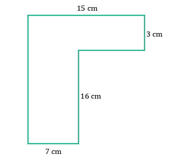 A composite shape is made up of two smaller rectangles. Rectangle 2 shares its upper side with rectangle 1, but rectangle 1 is wider and extends to the right. The upper side of rectangle 1 is marked 15 cm, the right side is marked 3 cm. The right side of rectangle 2 is marked 16 cm, the bottom side is marked 7 cm.